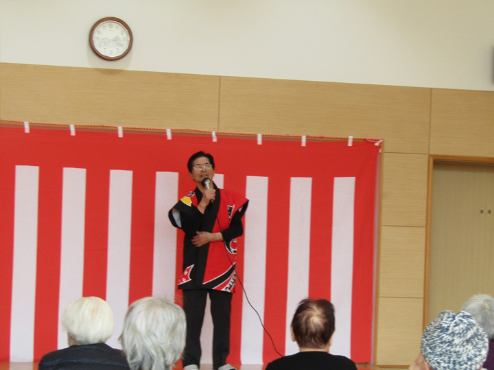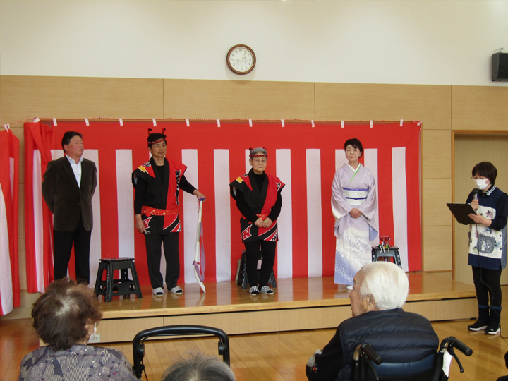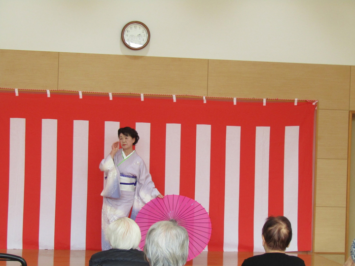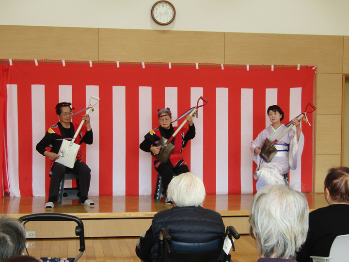 その後、特養の交流ホールに場所を移し、ボランティアの皆様にスコップ三味線や歌、踊りをご披露頂きました!